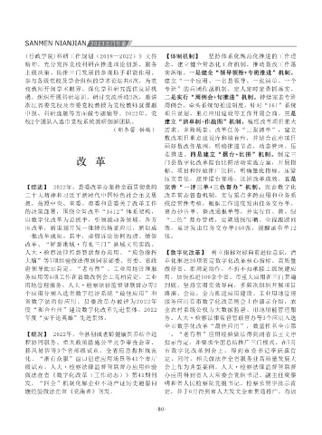 【意识形态】 重塑意识形态工作机制,高质量推 播放量达到55万。围绕三门努力建设科技型生态 单位创建工作通过省委民宗考核,民族共富得到 榴红”品牌培育,打造石榴红家园等阵地10余 订“侨助工坊”产业帮扶战略合作框架协议,签 【信访源头治理】 一是党建引领。县级层面:县 【规范业务办理】 一是开展《信访工作条例》集 培训班、公务员班及各类专题研讨班。二是开发 撰写能力。与县委、县政府政研室、组织部等部 省数字法治好应用。县委改革办被评为2022年 服务应用在市数字化改革例会上作演示介绍,农