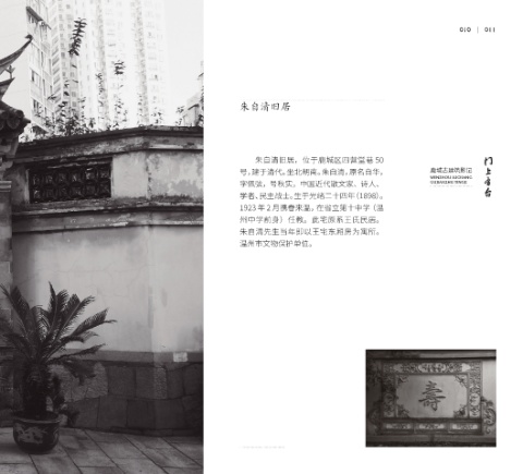 010 011 朱自清旧居 朱自清旧居,位于鹿城区四营堂巷 50 号,建于清代。坐北朝南。朱自清,原名自华, 鹿城古建筑影记 WENZHOU LUCHANG 字佩弦,号秋实,中国近代散文家、诗人、 GUJIANZHU YINGJI 学者、民主战士。生于光绪二十四年(1898)。 1923 年 2 月携眷来温,在省立第十中学(温 州中学前身)任教。此宅原系王氏民居。 朱自清先生当年即以王宅东厢房为寓所。 温州市文物保护单位。