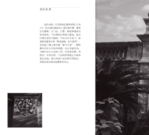 胡氏民居 038 039 胡氏民居 , 位于鹿城区矮凳桥路 22 弄 2 号 , 系民国时期当地人胡金弟所建。建筑 坐北朝南,由门台、正屋、厢楼等组成合 院式建筑。门台两侧为两根方壁柱。柱间 凹槽灰塑花鸟图案,中央为对开板门,板 侧框内塑有对联“厚德载物、和气致祥”。 花岗岩门楣上有字匾“紫气东来”。壁柱 腰间与柱头均出砖线脚,柱头有垂花饰。 顶部中央为火焰状山花,巴洛克风格,开 圆洞,环饰花草。门台两侧院墙上方做有 漏空花窗。胡氏民居门台风格中西结合, 具有民国传统民居建筑的特点。