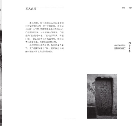 夏氏民居 046 047 夏氏民居,位于鹿城区五马街道鼓楼 社区柴桥巷 58 号 , 建于民国时期。建筑坐 北朝南,由门屋、正屋及厢房组成四合院式。 门屋面阔三间,为单层硬山顶建筑。门屋 南为门台院墙一堵,门台位于明间,青石 门框,门柱上部青石浮雕出动物,额枋上 青石雕有花草,两旁花篮式垂连柱。 此民居原为郑氏所建,后卖给夏氏夏 鹿城古建筑影记 WENZHOU LUCHANG 飞,夏飞重新改建了门台。夏氏民居为民 GUJIANZHU YINGJI 国时期温州市区典型传统建筑。
