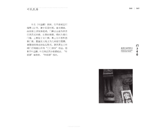 叶氏民居 068 069 叶氏(叶益麟)民居,位于鹿城区打 绳巷 112 号,建于民国时期。坐北朝南, 由前后三进院落组成。门屋正立面为西方 巴洛克式风格,石英砂抹面,明间为青石 门框,上置拉丁文门楣,再上为半圆形圆 拱门套。屋面女儿墙上为几何镂空图案, 墙面划线做成仿贴石形式。建筑原主人在 朔门打绳巷口开有“□□顺发”纸店,后 鹿城古建筑影记 WENZHOU LUCHANG 售于叶益麟。叶氏先后开办有银纸店、“叶 GUJIANZHU YINGJI 顺源”南货店、“叶顺源”钱庄。