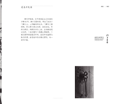 爱吾庐民居 082 083 爱吾庐民居,位于鹿城区五马街道永 宁巷 66 号,建于民国时期。青石门台连于 门屋之上,上部雕刻有虬龙。门屋为二层 结构,南立面为西式风格,进深五柱。东 西为厢房,西厢房保存二层,立面做宝瓶 式栏杆。二进正屋为二层硬山顶建筑,二 楼立面带做宝瓶式栏杆。爱吾庐民居原为 陈氏所建,此宅是中西合壁式建筑,有一 鹿城古建筑影记 WENZHOU LUCHANG 定的价值。 GUJIANZHU YINGJI