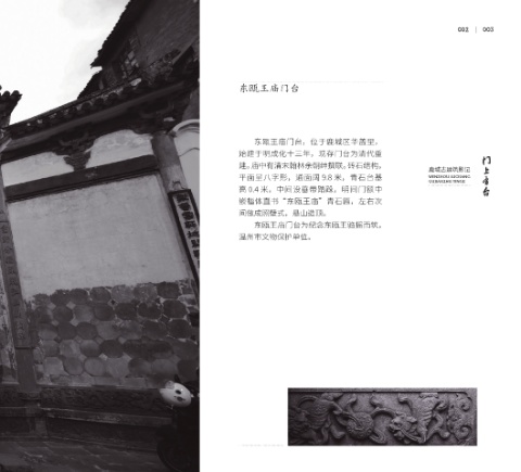 002 003 东瓯王庙门台 东瓯王庙门台,位于鹿城区华盖里, 始建于明成化十三年,现存门台为清代重 建。庙中有清末翰林余朝绅撰联。砖石结构, 鹿城古建筑影记 平面呈八字形,通面阔 9.8 米,青石台基 WENZHOU LUCHANG GUJIANZHU YINGJI 高 0.4 米,中间设垂带踏跺,明间门额中 嵌楷体直书“东瓯王庙”青石匾,左右次 间做成照壁式,悬山造顶。 东瓯王庙门台为纪念东瓯王驺摇而筑, 温州市文物保护单位。