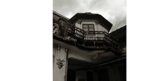 顶抹灰花纹。二层砖砌仿宝瓶式栏杆。东