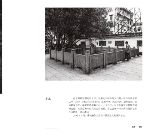 墨池 位于鹿城区墨池坊 1 号,现墨池公园西侧大门旁。相传东晋永和 三年(347)王羲之任永嘉郡守,临池作书,洗砚于池,故称墨池。墨 池略呈方形,南面向西南角凸出一小长方形,以块石垒筑成规整的池 塘立面,池沿原有一层花岗岩阶沿石,石上竖有一排封闭的花岗岩栏 杆和栏板,池水清冽。 1992 年 4 月,墨池被列为温州市第三批文物保护单位。 054 055