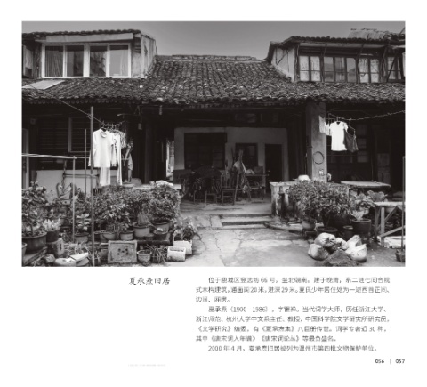 夏承焘旧居 位于鹿城区登选坊 66 号,坐北朝南。建于晚清,系二进七间合院 式木构建筑,通面阔20米,进深29米。夏氏少年居住处为一进西首正间、 边间、厢房。 夏承焘(1900—1986),字瞿禅。当代词学大师,历任浙江大学、 浙江师范、杭州大学中文系主任、教授,中国科学院文学研究所研究员, 《文学研究》编委,有《夏承焘集》八巨册传世。词学专著近 30 种, 其中《唐宋词人年谱》《唐宋词论丛》等最负盛名。 2000 年 4 月,夏承焘旧居被列为温州市第四批文物保护单位。 056 057