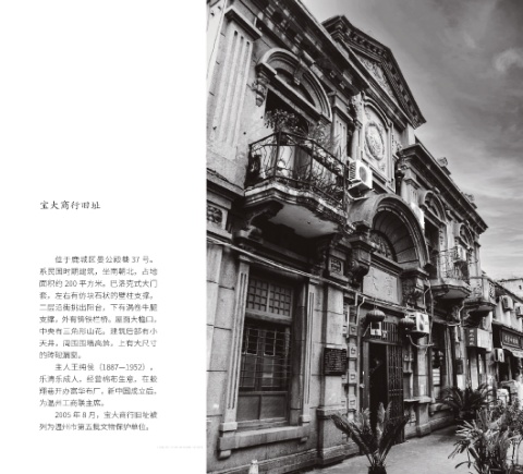 宝大商行旧址 位于鹿城区晏公殿巷 37 号。 系民国时期建筑,坐南朝北,占地 面积约 200 平方米。巴洛克式大门 套,左右有仿块石状的壁柱支撑。 二层沿街挑出阳台,下有涡卷牛腿 支撑,外有铸铁栏桥。屋面大檐口, 中央有三角形山花。建筑后部有小 天井,周围围墙高耸,上有大尺寸 的砖砌漏窗。 主人王纯侯(1887—1952), 乐清乐成人,经营棉布生意,在蛟 翔巷开办富华布厂,新中国成立后, 为温州工商联主席。 2005 年 8 月,宝大商行旧址被 列为温州市第五批文物保护单位。 072 073