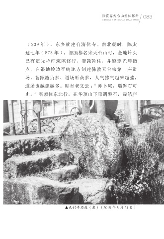 徐霞客天台山游记探析 083 XUXIAKE TIANTAISHAN YOUJI TANXI ( 239 年 ),东乡就建有清化寺。南北朝时,陈太 建七年( 575 年 ),智 慕名来天台山时,金地岭头 已有定光禅师筑庵修行,智 暂住,并遵定光师指 点,在银地岭边平畴地方创建佛教天台宗第一座道 场。智 随员多、道场听众多,人气佛气越来越盛, 道场也越建越多。时有老父云 :“ 师卜庵,遇磐石可 止。”智 往东北行,在华顶山下果遇磐石,遂结庐 ▲天封寺石鼓(东)(2015 年 5 月 21 日)
