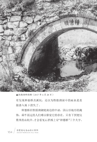 ▲铁船湖种德桥(2017 年 4 月 28 日) 有发现种德桥及溪坑,还以为铁船湖湖中的雨水是直 接渗入地下消失了。 种德桥在铁船湖湖底南边的中部,因山形地形的掩 饰,乘车而过的人们难以察觉它的存在。只有下到宽仅 数米的山坑中,才会看见石拱桥上有“种德桥”三个大字。 徐霞客天台山游记探析 164 XUXIAKE TIANTAISHAN YOUJI TANXI