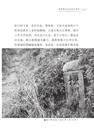 徐霞客天台山游记探析 027 XUXIAKE TIANTAISHAN YOUJI TANXI 松门岭下来一直往右走,想体验一下沿古道到西山下 村再过溪至上金村的路线。古道右靠山左靠溪,溪岸 上有少许田地,开头还可行走,拐个小弯后,路边无 田无地,路上植物遮天蔽日,我挥舞柴刀左冲右突, 但带刺的荆棘越来越密,每前进一步衣服裤子都会被 ▲松门岭古道(2015 年 1 月 10 日)