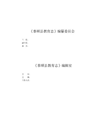 《泰顺县教育志》编纂委员会 主 任: 副主任: 委 员: 《泰顺县教育志》编辑室 主 审: 主 编: 工作人员: