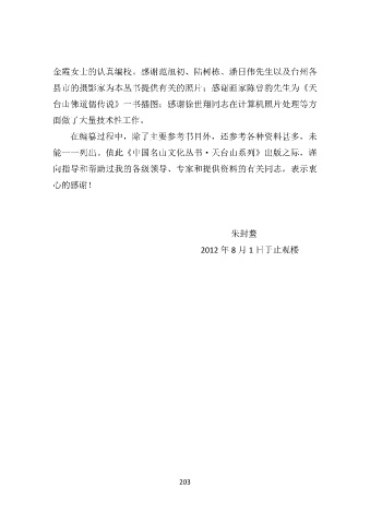 金霞女士的认真编校。感谢范旭初、陆树栋、潘日伟先生以及台州各 县市的摄影家为本丛书提供有关的照片;感谢画家陈曾豹先生为《天 台山佛道儒传说》一书插图;感谢徐世翔同志在计算机照片处理等方 面做了大量技术性工作。 在编纂过程中,除了主要参考书目外,还参考各种资料甚多,未 能一一列出。值此《中国名山文化丛书·天台山系列》出版之际,谨 向指导和帮助过我的各级领导、专家和提供资料的有关同志,表示衷 心的感谢! 朱封鳌 2012 年 8 月 1 日于止观楼 203