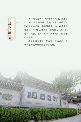 浙江天台山和合文化之旅 济 公 居 故 济公故居是济公活佛的降诞之地,坐落在 天台城区北边赭溪畔,占地 17 亩,荟萃宅第 街坊与楼台亭阁、水榭园林于一体,内聚佛国 之灵气,外撷仙山之精华,别致优美,其人物、 建筑、饮食,乃至一草一木无不透露、诠释着 和合文化。 济公故居里李府、陇西园、罗汉神木、和 合树等都很好地体现了和合文化。 36