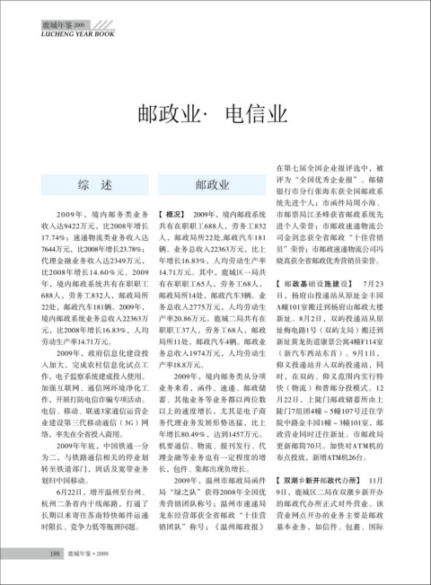 2009年,政府信息化建设投 务总收入1974万元,人均劳动生 (新汽车西站东首)。9月1日, 顺利实现了速递、物流两大业务 动,邮政部门配合国家惠农、 日,温州市局联同温州市春运
