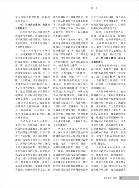 展。加强社区卫生服务中心规范 目标,以建国60周年安全保卫为 访秩序。深入开展安全生产“三 限、工作措施,切实抓好落实。 法,努力提高基层党建工作整 上,在抓落实上谋实招、下苦