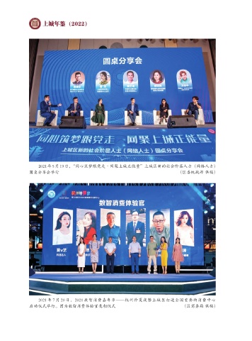 上城年鉴 (2022) 2021年5月19日,“同心筑梦跟党走·网聚上城正能量”上城区新的社会阶层人士 (网络人士) 圆桌分享会举行 (区委统战部 供稿) 2021 年 7 月 20 日,2021 数智消费嘉年华——杭州仲夏夜暨上城区打造全国重要的消费中心 启动仪式举行。图为数智消费体验官亮相仪式 (区商务局 供稿)