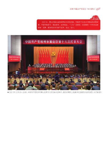 庆祝中国共产党成立 100 周年丨 2021 年,萧山区委认真贯彻落实中央和省委、市委关于党史学习教育的决策部 署,开展专题学习、理论研究、宣讲展演、“三为”实践等,切实擦亮“中共农运发 轫地”品牌,推动党史学习教育走深、走实、走心。 2021 年 12 月 29—30 日,中国共产党杭州市萧山区第十六次代表大会举行。图为开幕式上区委书记王敏向大会作报告(范方斌 摄)