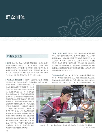 【概况】 2021 年,萧山区有两级管理镇(街道)总工会 22 家, (工匠)协会优化劳模(工匠)服务,开展重大节日走访慰问,