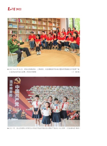 2022 2021 年 4 月 26 日,参加过淮海战役、上海战役、抗美援朝战争的老兵董慎然受邀到北干街道广德 小区讲述当年战斗故事,传承红色精神 (丁 毅 摄) 2021 年,萧山区湖滨小学学生以手绘红色连环画庆祝中国共产党成立 100 周年 (区委宣传部 提供)