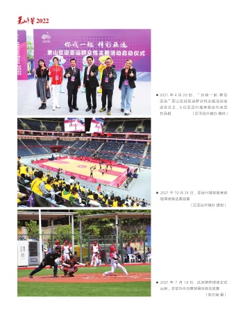 2022 2021 年 4 月 28 日,“ 你 我 一 起 精 彩 亚运”萧山区迎亚运群众性主题活动启 动仪式上,6 位亚运兴城体验官代表登 台亮相 (区亚运兴城办 提供) 2021 年 10 月 31 日,亚运兴城体验官体 验篮球测试赛观赛 (区亚运兴城办 提供) 2021 年 7 月 18 日,瓜沥镇棒球场正式 启用,并举办中日棒球俱乐部交流赛 (范方斌 摄)