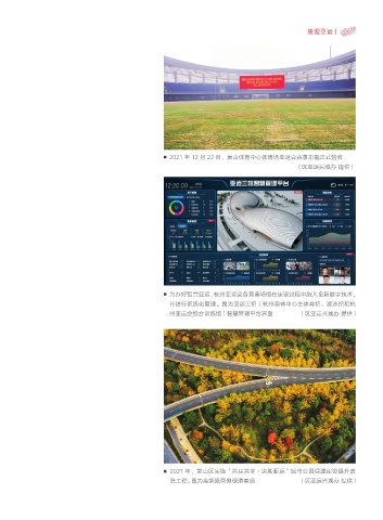 喜迎亚运丨 2021 年 12 月 22 日,萧山体育中心体育场亚运会赛事功能正式验收 (区亚运兴城办 提供) 为办好智慧亚运,杭州亚运会各竞赛场馆在建设过程中融入全新数字技术, 并进行系统化管理。图为亚运三馆(杭州奥体中心主体育馆、游泳馆和杭 州亚运会综合训练馆)智慧管理平台界面 (区亚运兴城办 提供) 2021 年,萧山区实施“共建共享·决胜亚运”城市公园绿道建设提升改 造工程。图为高架路两侧绿道景观 (区亚运兴城办 提供)