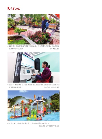 2022 2021 年,萧山区继续开展美丽家园建设,优化农村人居环境。图为党湾镇 庆丰村一户村民院落 (王啸虎 摄) 2021 年 10 月 19 日,衙前镇凤凰社区居民在社区卫生服务站健康微诊室 使用智能检测设备 (范方斌 华兴桥 摄) 萧山区首个村级室外标准泳池——衙前镇凤凰村新盛游泳场 (徐国红 摄于 2021 年 8 月)