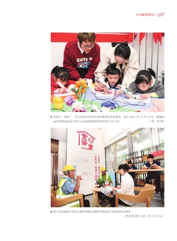 共同富裕建设丨 为助力“双减”,萧山区部分社区开设丰富多彩的社团课。图为 2021 年 11 月 19 日,城厢街 道东阳桥社区青少年中心社团老师指导学生进行 3D 打印 (唐 柯 摄) 钱江世纪城浙江商会大厦内的爱心驿家为附近务工者提供休息场所 (范方斌 摄于 2021 年 7 月 8 日)
