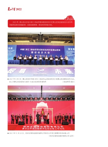 2022 2021 年,萧山区以中国(浙江)自由贸易试验区杭州片区萧山区块建设动员大会开局, 克服新冠肺炎疫情影响,加速动能转换,推动经济转型升级。 2021 年 1 月 6 日,萧山区召开中国(浙江)自由贸易试验区杭州片区萧山区块建设动员大会。 会上为萧山区块首批入驻的 10 家企业颁发营业执照 (区商务局 提供) 2021 年 11 月 22 日,杭州正强传动股份有限公司首次公开发行股票并在创业板上市 (杭州正强传动股份有限公司 提供)