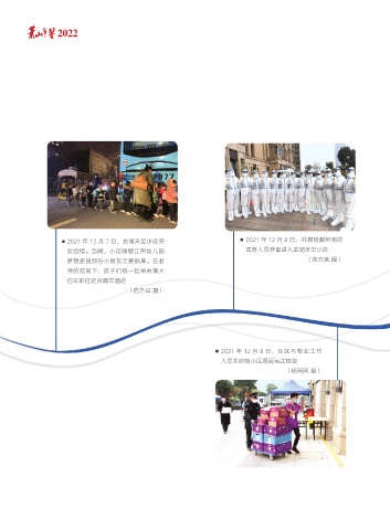 2022 2021 年 12 月 7 日,龙湖天玺小区突 2021 年 12 月 8 日,开展核酸检测的 发疫情。当晚,小区隔壁江南幼儿园 医务人员准备进入龙湖天玺小区 梦想家园部分小朋友需要隔离。在老 (范方斌 摄) 师的陪同下,孩子们统一搭乘两辆大 巴车前往定点隔离酒店 (范方斌 摄) 2021 年 12 月 8 日,社区与物业工作 人员为封控小区居民运送物资 (杨圆圆 摄)