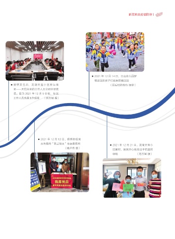 新冠肺炎疫情防控丨 2021 年 12 月 14 日,江南幼儿园梦 想家园的孩子们结束隔离回园 疫 情 发 生后, 龙 湖 天 玺 小 区 所 在社 (区疫情防控办 提供) 区——天悦社区的工作人员立即开展流 调。图为 2021 年 12 月 9 日夜,社区 工作人员流调工作现场 (范方斌 摄) 2021 年 12 月 12 日,疫情防控党 员先锋岗“我是党员”志愿者值岗 2021 年 12 月 21 日,龙湖天玺小 (楼卢伟 摄) 区解封,居民开心地亮出手机里的 绿码 (范方斌 摄)