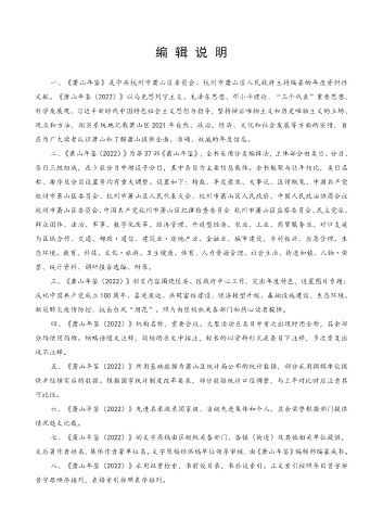 二、《萧山年鉴(2022)》为第 37 部《萧山年鉴》,全书采用分类编辑法,主体部分由类目、分目、