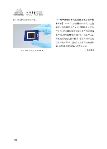 镇海年鉴 2022 ZHEN HAI YEAR BOOK 在 4 家光伏企业中试验证。 【 5 -羟甲基糠醛率先在国际上建立生产技 术体系】 2021 年,宁波材料所开发出生物 基新材料关键原料 5 -羟甲基糠醛成套生 产工艺,建成国际首条可连续生产的百吨级 生产线,为米其林等企业供货。该生产工艺 突破欧美构建的技术体系,率先在国际上建 立生产技术体系,为国内自主生产呋喃型聚 酯、抑菌剂、胶黏剂等产品奠定基础。 新型 TOPCon晶体硅太阳电池 (高晓静) 3 2 4