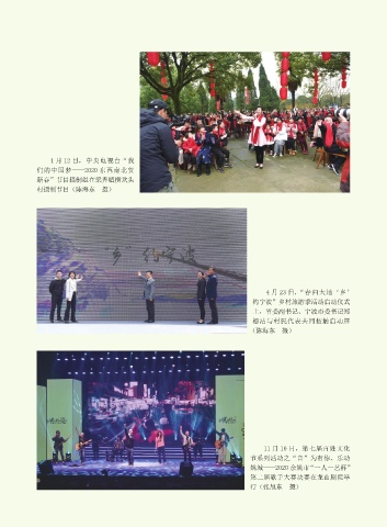 1 月 12 日,中央电视台“我 们的中国梦——2020 东西南北贺 新春”节目摄制组在梁弄镇横坎头 村摄制节目(陈海东 摄) 4 月 23 日,“春归大地‘乡’ 约宁波”乡村旅游季活动启动仪式 上,省委副书记、宁波市委书记郑 栅洁与村民代表共同按触启动屏 (陈海东 摄) 11 月 10 日,第七届百姓文化 节系列活动之“音”为有你、乐动 姚城——2020 余姚市“一人一艺杯” 第二届歌手大赛决赛在龙山剧院举 行(张旭东 摄)