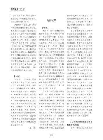 2020 年,全市水库、河网 56.8%。全年汛期共有 3 个台风 门泵站强排功能,共排水 798