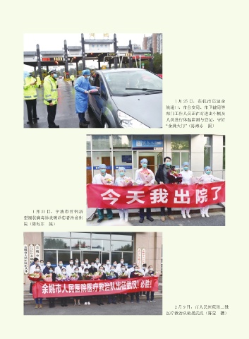 1 月 25 日,在杭甬高速余 姚道口,市公安局、市卫健局等 部门工作人员正在对进出车辆及 人员进行体温监测与登记,守好 “余姚大门”(陈海东 摄) 1 月 31 日,宁波市首例新 型冠状病毒肺炎确诊患者治愈出 院(陈海东 摄) 2 月 9 日,市人民医院第二批 医疗救治队驰援武汉(陈莹 摄)