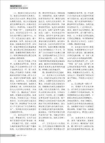 党建的助推作用。 提议制度。全面开展乡镇党代表 员有序政治参与,推进民主政治 健康有序开展。 查,对土地拆迁安置、工程建设、 建工作综合考核评价体系。完善