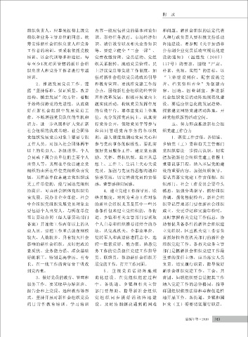 发挥党组织参与决策作用。新社 急需的技术管理人才,特别是政 团式服务”工作,发挥社会协同 协商后,可由社会团体党组织负 4.建立党建工作指导员、联 抓总,加强分类指导,抓好组织