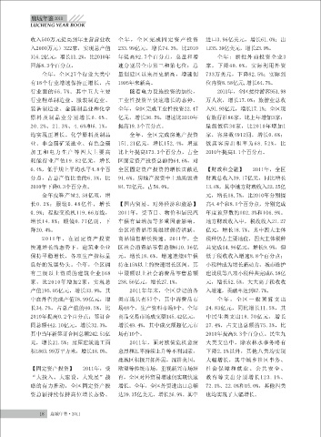 2011年,在固定资产投资 商品销售增长快速。2011年,全 税种仍占主要地位,四大主体税种 11处,疏通下水道1.70万米,清理 儿园涵盖区内所有中小学、幼儿 【文化体育和卫生】 至2011年年