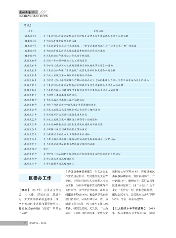 【概况】 2015年,区委办围绕区 文件21件,文件合法合规率、备案及 半月“无会旬”制,控制会议规模,