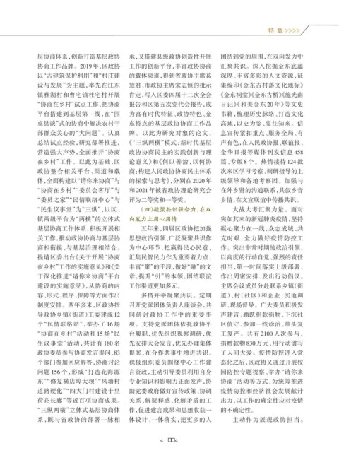 基层协商工作体系,积极开展相 五年来,四届区政协把加强 凝心聚力在一线,众志成城、共