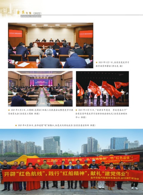 金 金 东 年 鉴 (2022) 东 JINDONG NIANJIAN ◉ 2021年3月1日,金东区党史学习 教育动员部署会(黄文龙 摄) ◉ 2021 年 4 月 2 日,工商联(总商会)四届三次执委会议暨党史学习教 ◉ 2021 年 4 月 15 日,“宣讲百年党史 寻迹青春打卡” 育动员大会(金东区工商联 供图) 金东区青年党史学习宣讲活动启动仪式(金东区融媒体 中心 供图) ◉ 2021年4月28日,金华道情“唱”游婺江,红色文化源远流长(金东区委宣传部 供图)
