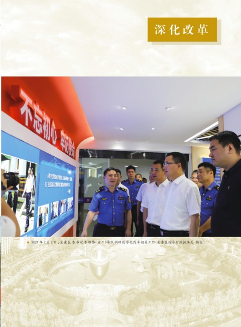 深 化 改 革 >>>> 深 化 改 革 ◉ 2021 年 7 月 2 日,金东区委书记李雄伟(右二)率队调研数字化改革相关工作(金东区综合行政执法局 供图)