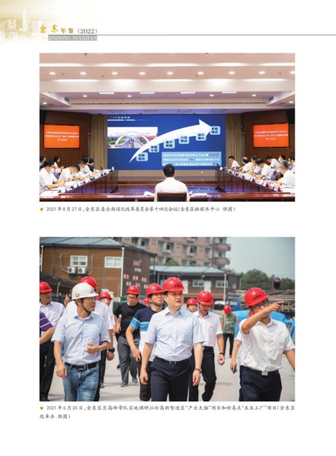 东 金 金 东 年 鉴 (2022) JINDONG NIANJIAN ◉ 2021年8月27日,金东区委全面深化改革委员会第十四次会议(金东区融媒体中心 供图) ◉ 2021 年 6 月 26 日,金东区长高峰带队实地调研江岭高新智造区“产业大脑”项目和好易点“未来工厂”项目(金东区 改革办 供图)