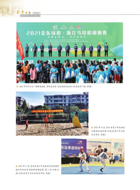 金 金 东 年 鉴 (2022) 东 JINDONG NIANJIAN ◉ 2021年4月18日,跑醉美绿道 秀和美金东”金东绿道马拉松(金东区岭下镇 供图) “ ◉ 2021年10月,浙江省青少年运动会 沙滩排球冠军赛(金东区青少年业余 体育学校 供图) ◉ 2021年11月,金东区青少年业余体育学校跆拳 道队参加金华市跆拳道锦标赛,获 11 金 14 银 16 铜(金东区青少年业余体育学校 供图)