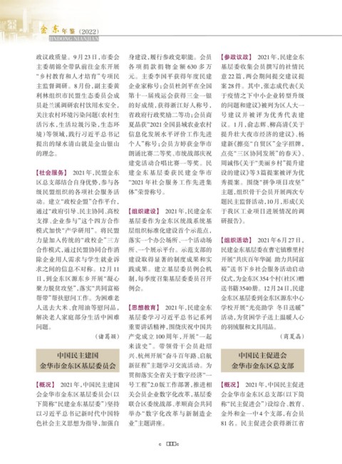 【社会服务】 2021年,民盟金东 建 金 东 基 层 委 获 民 建 金 华 市 设的建议》等 3 篇提案被评为优