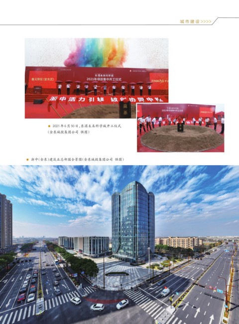 城 市 建 设 >>>> ◉ 2021 年 6 月 30 日,东湄未来科学城开工仪式 (金东城投集团公司 供图) ◉ 浙中(金东)建筑业总部园全景图(金东城投集团公司 供图)