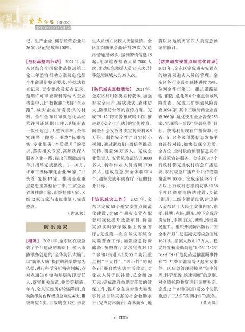 【概况】 2021年,金东区在应急 风险普查工作;加强应急物资 1621次,参演人数8.17万人。稳