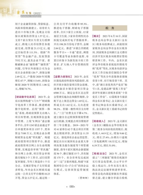 和全网上办理,项目资金审核 度 56 个,修订制度 15 个,共有制 【税收法治】 2021 年,金东区