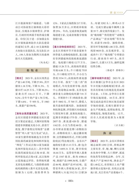 用抗菌药减量化和饲料环保化 防疫法》等法规宣传。金东区产 【概况】 2021年,金东区养殖水