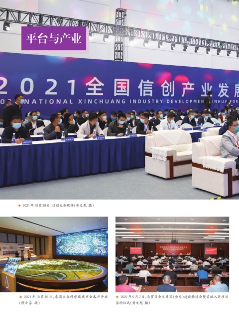 金 金 东 年 鉴 (2022) 东 JINDONG NIANJIAN 平台与产业 ◉ 2021年10月28日,信创大会现场(黄文龙 摄) ◉ 2021 年 10 月 10 日,东湄未来科学城城市会客厅开放 ◉ 2021 年 5 月 7 日,自贸区金义片区(金东)建设推进会暨首批入区项目 (缪小芬 摄) 签约仪式(黄文龙 摄)